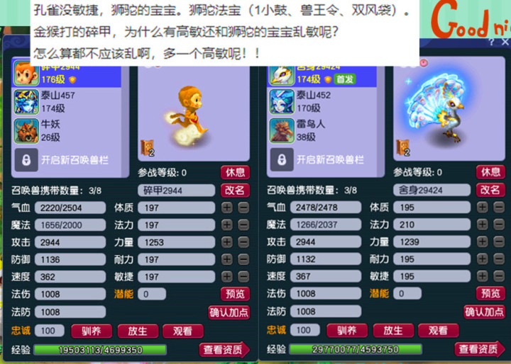上面的这两只召唤兽左边的召唤兽是有高级敏捷的,右边的召唤兽没有高级面积,这两只召唤兽的面板速度属性是差不多的,理论上拥有高级敏捷的召唤兽会一直优先出手,但是当孔雀被兽王令加成之后却总是会出现乱敏的状态,也就是这两只召唤兽实际上的速度属性是差不多的,通过这么对比会发现兽王令人对于召唤兽速度属性的加成其实是能够赶得上高级敏捷的。