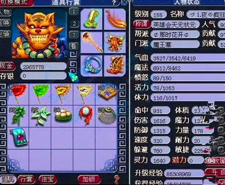 上面的这一个是梦幻西游在155时代时的服战角色,该角色的门派是魔王寨。当时的灵力达到了1640 ,6400的气血和1300的防御,当时这种魔王寨就已是很强的了,但是现在这种魔王寨却不够用,现在的这种魔王寨将灵力换成法伤也就是1800 1900左右。现在这种属性的魔王寨在现在梦幻西游的任务系统中都不一定有人要。而且上面这个魔王寨的速度属性有点太慢了,159级的法系的速度需要达到500以上才能够比较好混队。